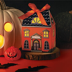 敲敲門,不給餅乾就搗蛋。經典橘色萬聖小鬼屋,當作擺飾營造出濃濃的萬聖節氣氛。