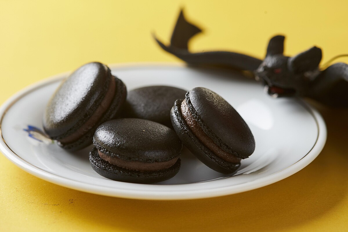 馬卡龍有別以往繽紛形象,以竹炭粉作為外殼原料,讓顏色呈現出黑金質感,填入無糖芝麻內餡,爆香濃郁的香氣及帶有甜蜜口感。