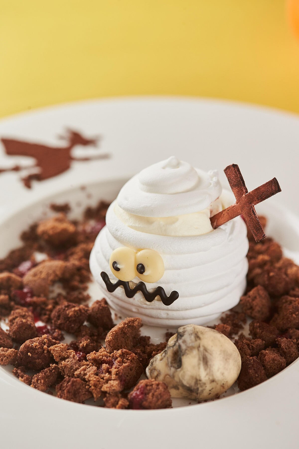 使用Q軟麻糬做成外型可愛的精靈小鬼,包覆以日本進口柚子汁熬煮而成的柚子慕斯及金桔凍,以巧克力沙布列餅乾當底座盛裝,並以黑白巧克力施以奇幻神情及用巧克力小蜘蛛網點綴增添趣味感。入口厚實酸甜的柚子慕斯香氣交織金桔柚子凍清爽口感再搭配餅乾,每口都讓人驚喜!