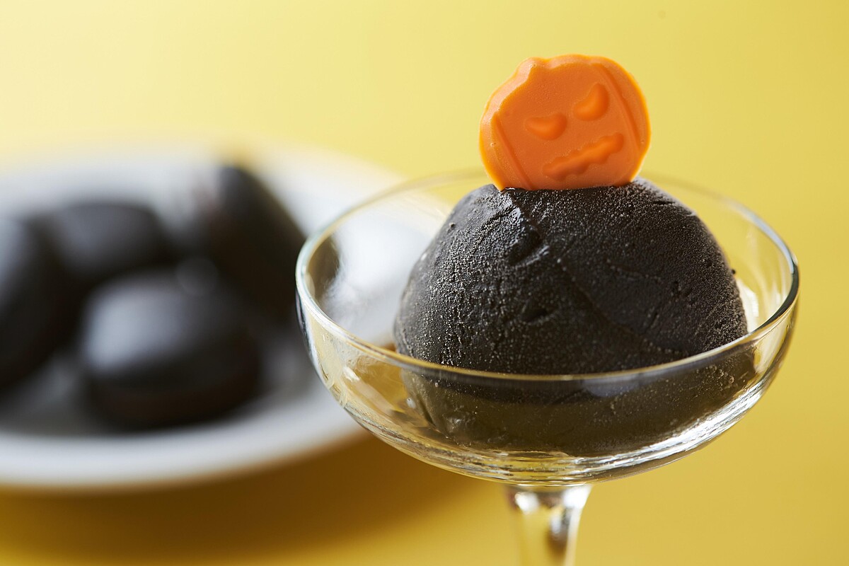 以巧克力為基底的冰淇淋,加上竹炭粉使其在視覺上更神秘且因黯黑到極致而閃耀出光芒,