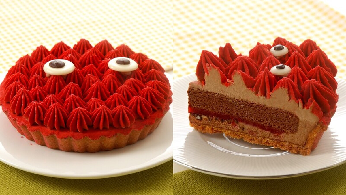逼真又可愛的眼睛,以戚風蛋糕為主體,香濃的白巧克力是眼白,再用酸甜草莓果醬畫上淡淡血絲。一旁用小惡魔造型卡點綴,雖然嚇人但又帶點俏皮,搭配著香草慕斯及草莓慕斯,每ㄧ口都充滿萬聖節的派對氛圍。
