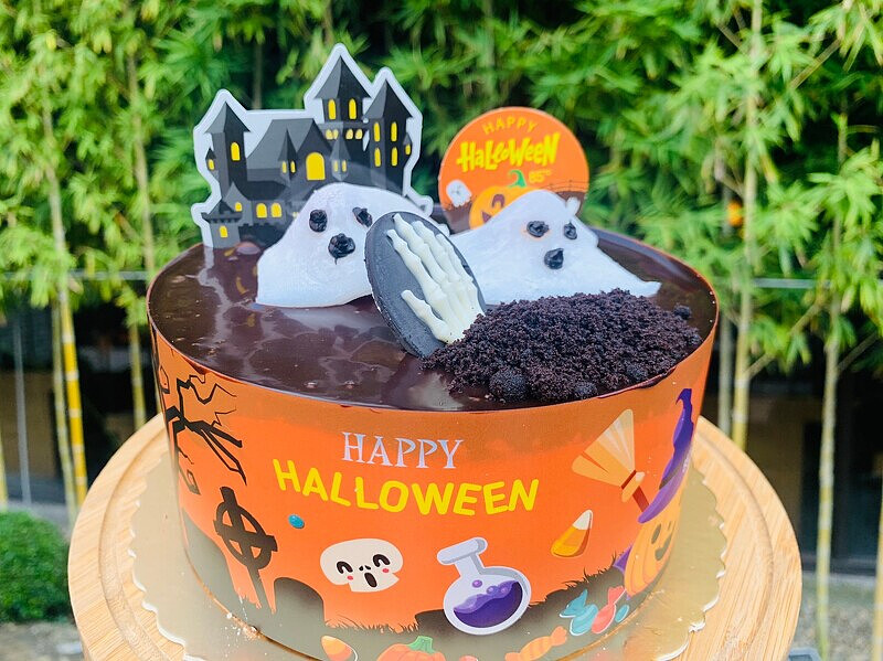 濃濃的酥脆巧克力淋面包覆扎實濃厚蛋糕,外層裹著杏仁顆粒,內餡夾心香濃巧克力餡,香脆多層口感,讓您一口接著一口停不下來!蛋糕上頭還頂著立體Q版的幽靈大頭,萌萌的鬼怪氣氛,是最具節慶的萬聖節甜品。