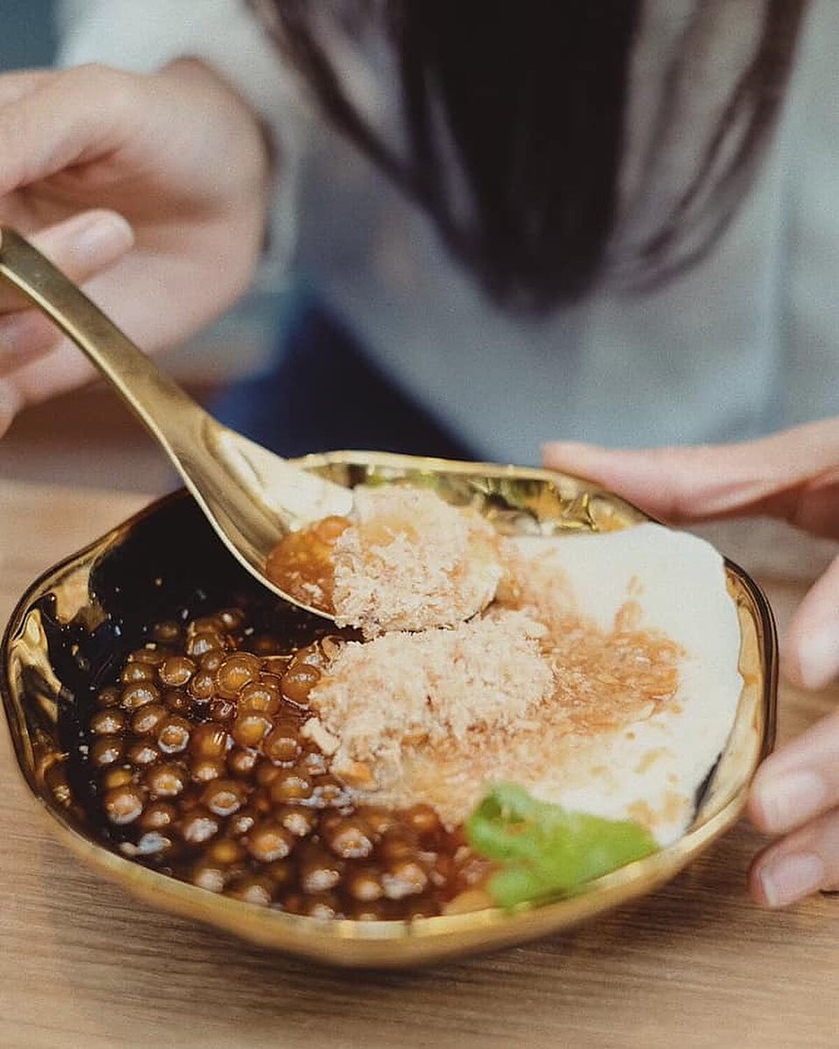 初訪的人必點超人氣的「麥芽糖花生豆花」,以黑糖風味的糖水為基底,再加入Q軟的粉圓及現磨的花生糖粉更增添香氣與口感,並佐以香菜,整體風味完全不會過於甜膩,與花生捲冰淇淋有異曲同工之妙!