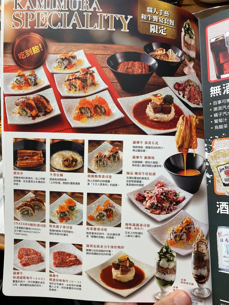 除了肉品本身之外,在《上村牧場》也能吃到壽司系列,包括「炙燒壽喜燒壽司卷」、「酪梨鮭魚壽司卷」、「烤牛肉壽司卷」等,另外還有「羅西尼風菲力牛排佐鴨肝」以及「麻辣五花牛拉麵」也是經典菜色之一。