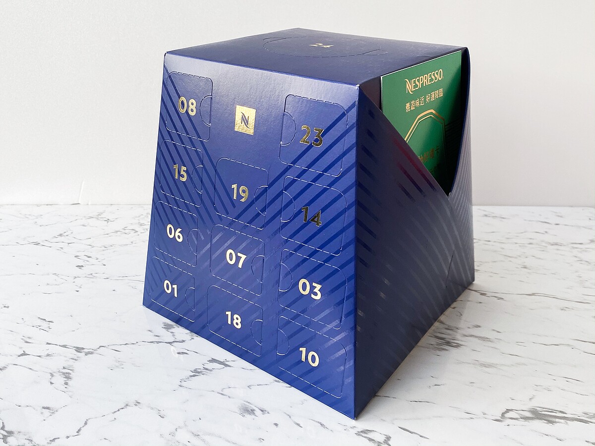 而通常潘妮朵妮終會加入新鮮的果乾、堅果,多層次的豐富口感,正是完美呼應了Nespresso聖誕倒數月曆!沉穩的湛藍色搭配金色的線條,低調中兼具奢華質感。