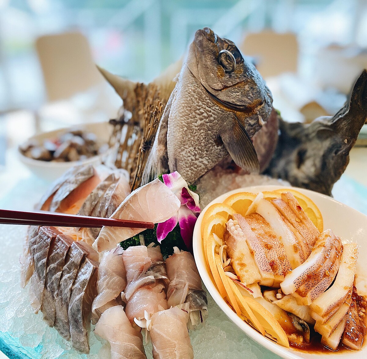 漁會經營的餐廳,當然其他海鮮類的菜色美味程度也不在話下,現流海魚一魚兩吃、清蒸回首魚和鮮蝦米粉,一魚兩吃的生魚片不但口感扎實,也完全沒有腥味、新鮮真美味,連平常不敢吃生魚的人也不會害怕!