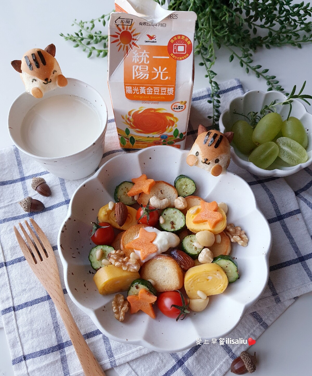 人氣部落客「愛上早餐」時常在粉絲專頁上分享各式料理,變化多端的擺盤組合讓平凡的食物看起來更加美味,天氣轉涼的秋日,她也分享了一道開啟一天陽光好心情的早餐提案,利用牛奶棒麵包做出小松鼠造型,搭配簡單的玉子燒和蔬菜沙拉,繽紛又美味的組合讓人忍不住一口接一口。除了充滿儀式感的餐桌外,營養也是她非常重視的一環,早餐的飲品首選就是採用非基改黃豆的統一陽光黃金豆豆漿,裡頭所含的豆類營養不僅能夠幫助思緒清晰、帶給身體活力,大豆異黃酮更是植物性女性賀爾蒙,讓忙碌的媽媽保持青春活力。更有含糖、低糖高纖、無加糖高纖三種口味能夠滿足全家需求,不僅能夠迅速補充營養少負擔,好喝的口感也讓心情陽光起來。