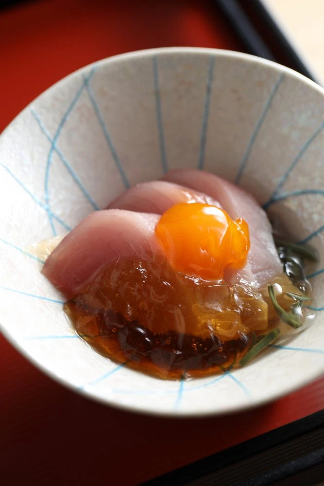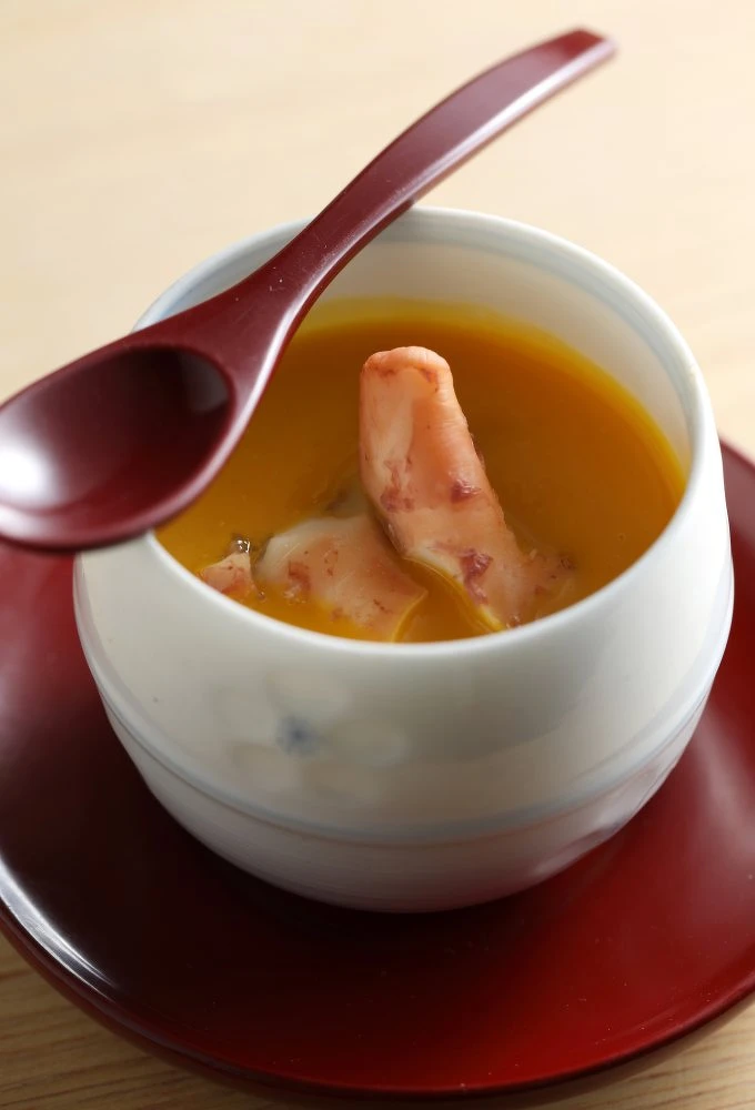 吹彈可破的蒸蛋,精準拿捏雞蛋和水的添加比例,上菜時淋上以日本栗子南瓜泥混合雞白湯調製的醬汁,點綴以紅豆滷煮、染色的軟絲或香煎章魚腳,視覺與味蕾一次滿足。