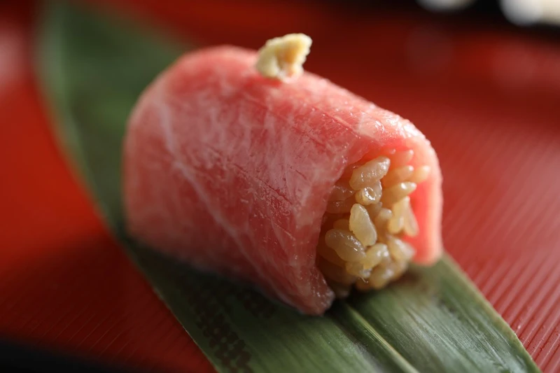 肥美的鮪魚大腹肉以細膩刀工劃出刻痕,包覆在調和了紅醋的壽司飯上,將台灣山葵泥點綴在魚肉上馨香不嗆,與黑鮪魚脂香完美搭配,讓人意猶未盡。
