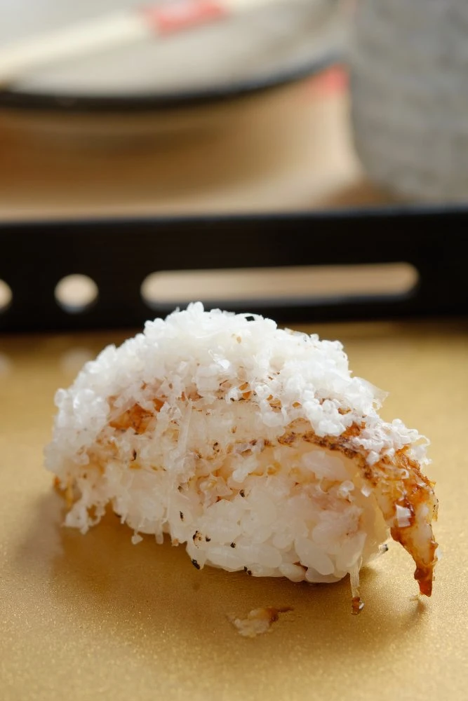 白醋飯添加些許的台灣紅藜增添口感,將甜糯墨魚鋪排飯上再搭佐兩尾葡萄蝦,賣相澎湃大器,提味的柚子胡椒和大葉香氣迷人,替握壽司更添亮點。
