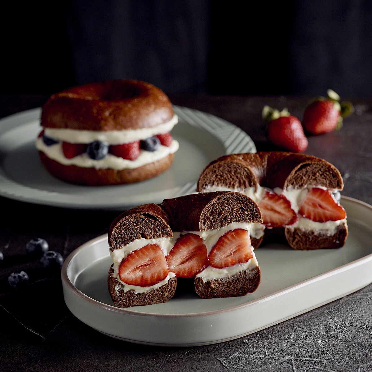 嚴選當季盛產的鮮嫩草莓,在極厚的奶油乳酪上鋪上滿滿7顆,伴隨果肉札實飽滿的藍莓與濃郁綿密的蜂蜜奶油乳酪抹醬。