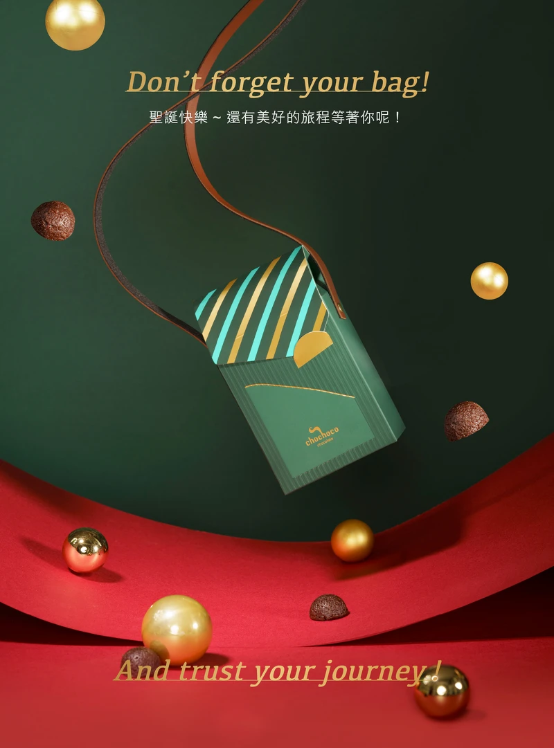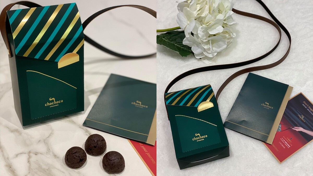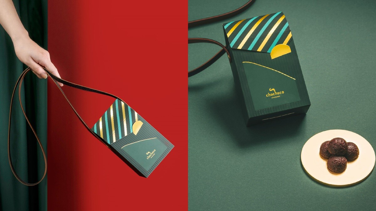 不拘泥於傳統禮盒形式,《Chochoco Chocolate》2020年末祭出的聖誕小方包,以沉著的墨綠為主色,盒面壓紋交錯燙金線條,加上牛皮繩背帶,外觀高雅又時尚。