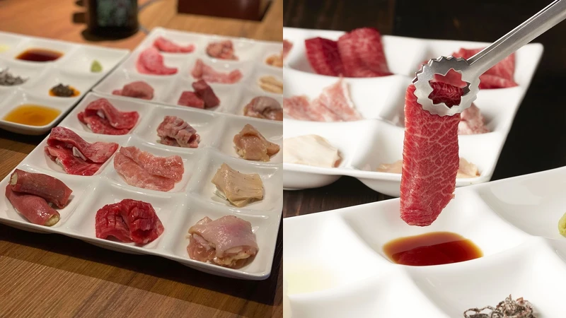 這次推出的燒肉9宮格,分別是「經典燒肉饗宴(二人份)」與「極致燒肉饗宴(二人份)」,包括澳洲鹽蔥牛舌、澳洲和牛上等牛五花、GETA牛五花、美國去骨牛小排、西班牙伊比利豬肋條、霜降豬、雞腿肉、牛肚與牛黃喉等通通吃得到,更將每款肉品搭配不同特色沾醬,讓各位品嚐到不同的味蕾饗宴。