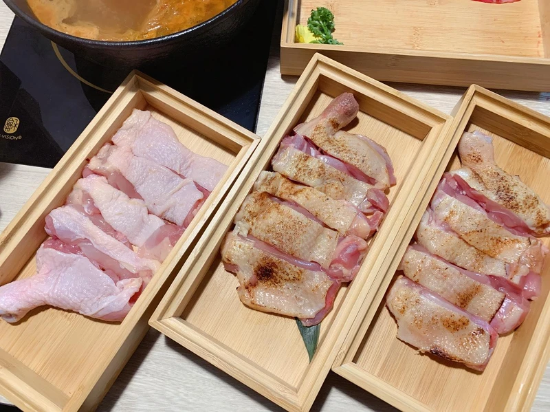 雞肉部分則採用現流無骨雞腿、不能錯過主廚推薦的2款炙燒料理的雞腿肉:秘製炙燒無骨雞腿肉、經典花雕炙燒雞腿。透過炙燒料理手法,逼出雞肉本身油脂所散發的自然獨特香氣,再將雞腿肉放入湯底煮熟後食用別具一番風味及獨特口感。