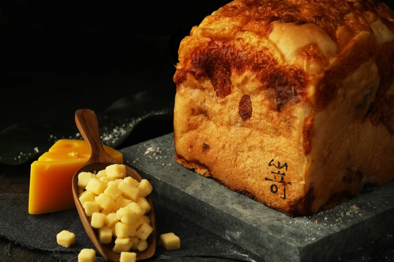 在《嵜本SAKImoto Bakery》新光南西店不只有經典口味「極美自然吐司」和「極生奶油牛奶吐司」,以及15款特製果醬,這裡更有獨家限定口味「極起士生吐司」,嚴選荷蘭進口高達起士,表面撒上滿滿高達起士後進行烘烤,喜歡鹹味吐司的人必嚐,而且是每週三才有。