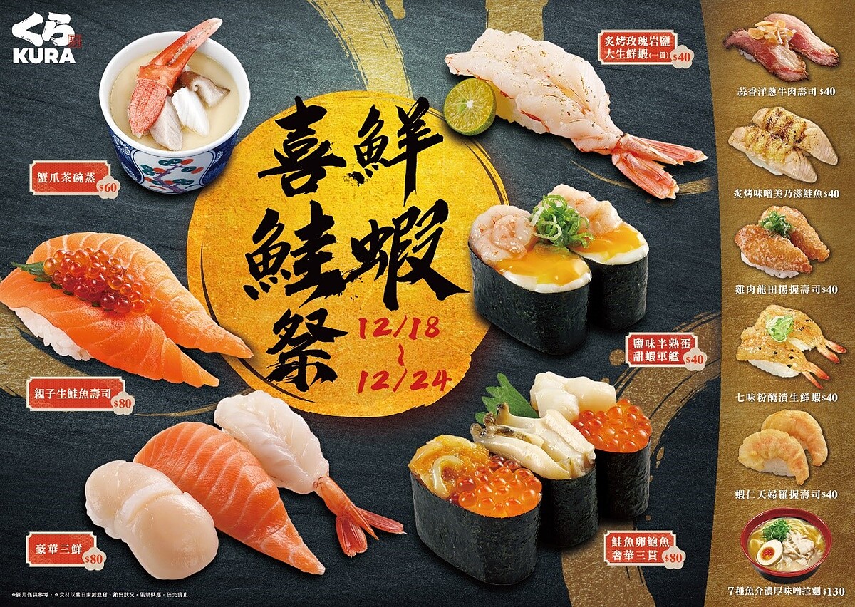 以「鮮蝦」、「鮭魚」等食材交織而成的美味盛宴「鮮蝦喜鮭祭」,用12款壽司滿足壽司控的味蕾。推出全新菜色「鮭魚卵鮑魚奢華三貫」使用了鮑魚、小貝柱、海鮮海膽、大粒鮭魚卵等頂級食材,將三貫豪邁盛入一盤,讓視覺與味蕾一次滿足!另外.經典的鮭魚控夢幻逸品「親子生鮭魚壽司」,以及濃郁鹹香令人口齒留香的「炙烤味噌美乃滋鮭魚」,喜愛鮭魚的饕客千萬不能錯過!