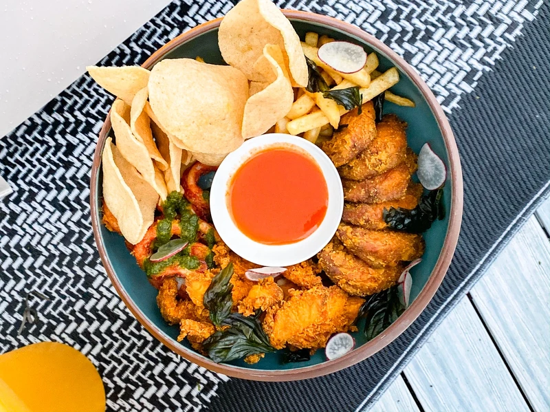 喝酒搭配炸物拼盤超療癒,裡面有超涮嘴的香檸青醬魷魚圈、薯條、火山椒麻雞炸雞翅、酥脆的松露脆蝦餅,不只是一般的炸物,搭配特調的酸辣醬,酸甜滋味讓人一口接一口!