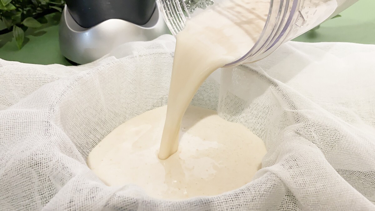 3、用堅果奶袋或粗棉布過濾燕麥奶。