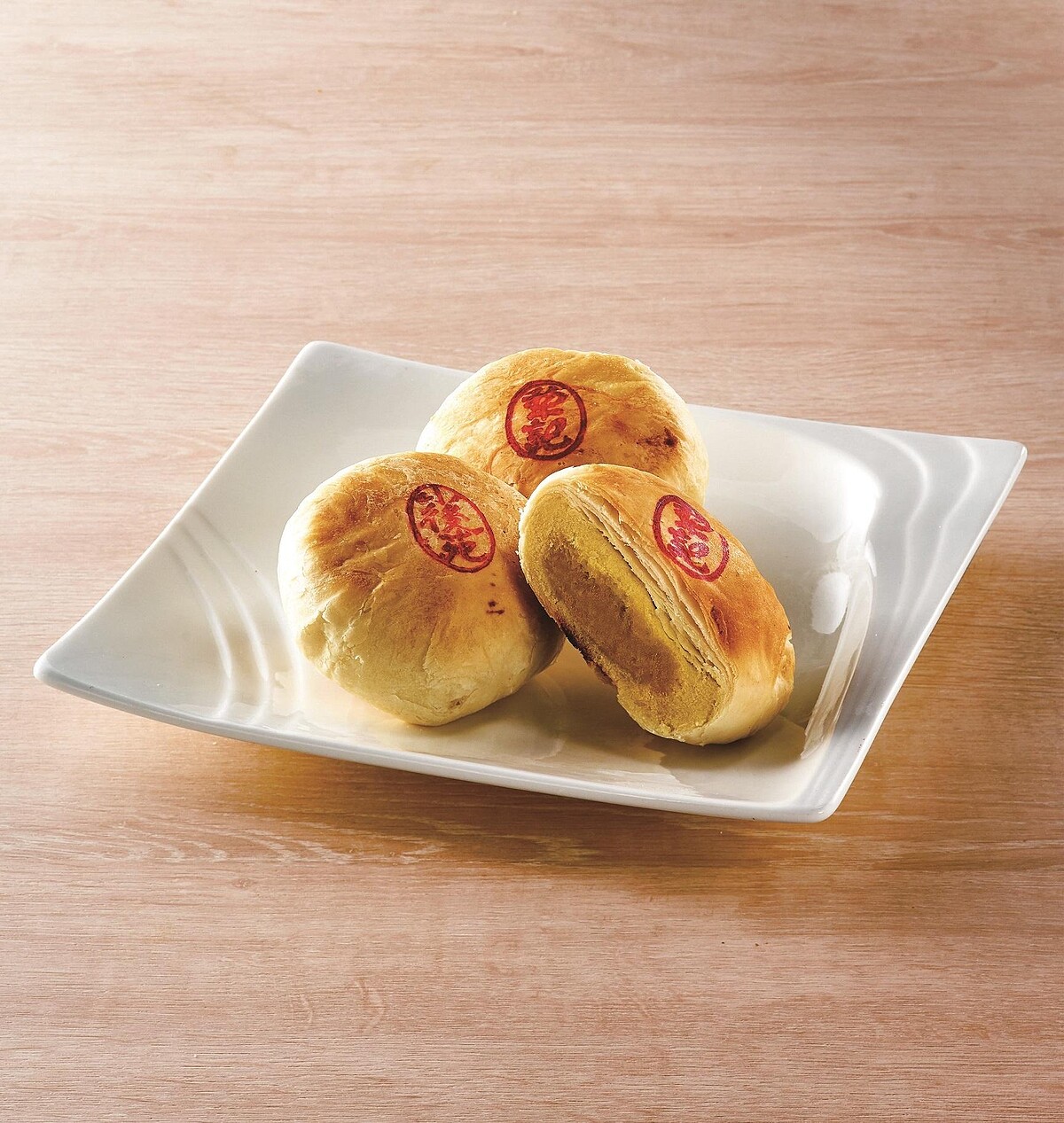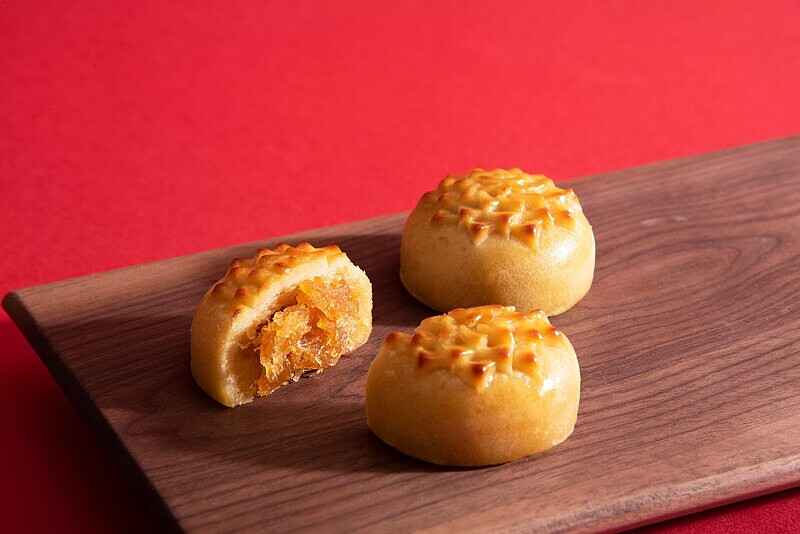 以經典的酸甜鳳梨醬製作內餡,搭配細膩滑順的鹹香奶黃,入口感受鳳梨果香的酸甜風味,外層為口感綿密的桃山餅皮,最上層以「鳳梨花」壓紋華麗綻放。