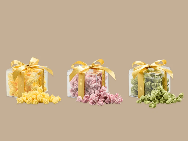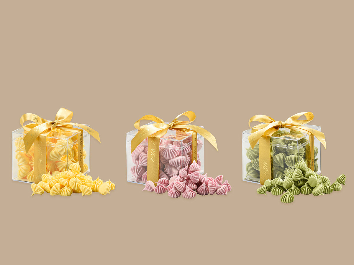 以簡單的食材蛋白與糖,在嘴裡展現出細緻的變化,外形打造成水滴花的可愛形狀,外脆內綿,入口清脆、香甜,入口即化的口感彷彿戀愛般地甜蜜滋味。