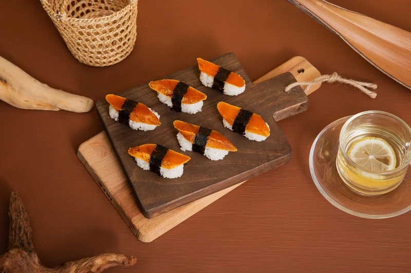 這次在高雄巨蛋設立的期間限定快閃櫃,推出禮盒包裝、全新口味,外盒設計以高雅的勃根地紅搭配象徵豐收的魚群為出發,並以精品巧克力的包裝為發想,讓在地烏魚子宛如精品甜點般精緻!