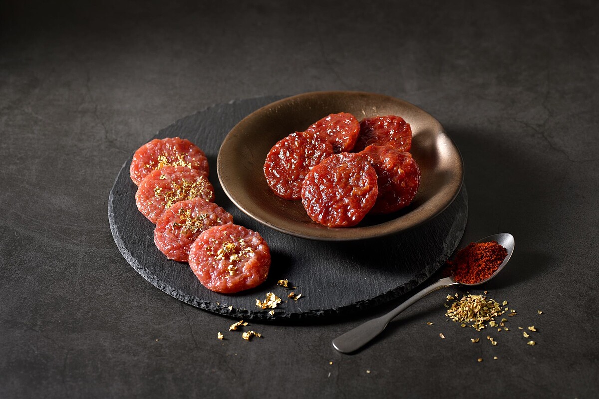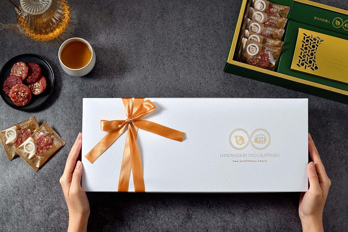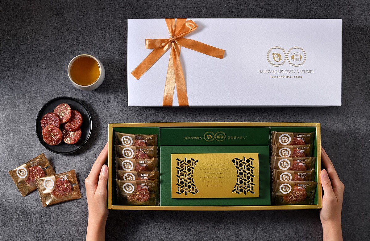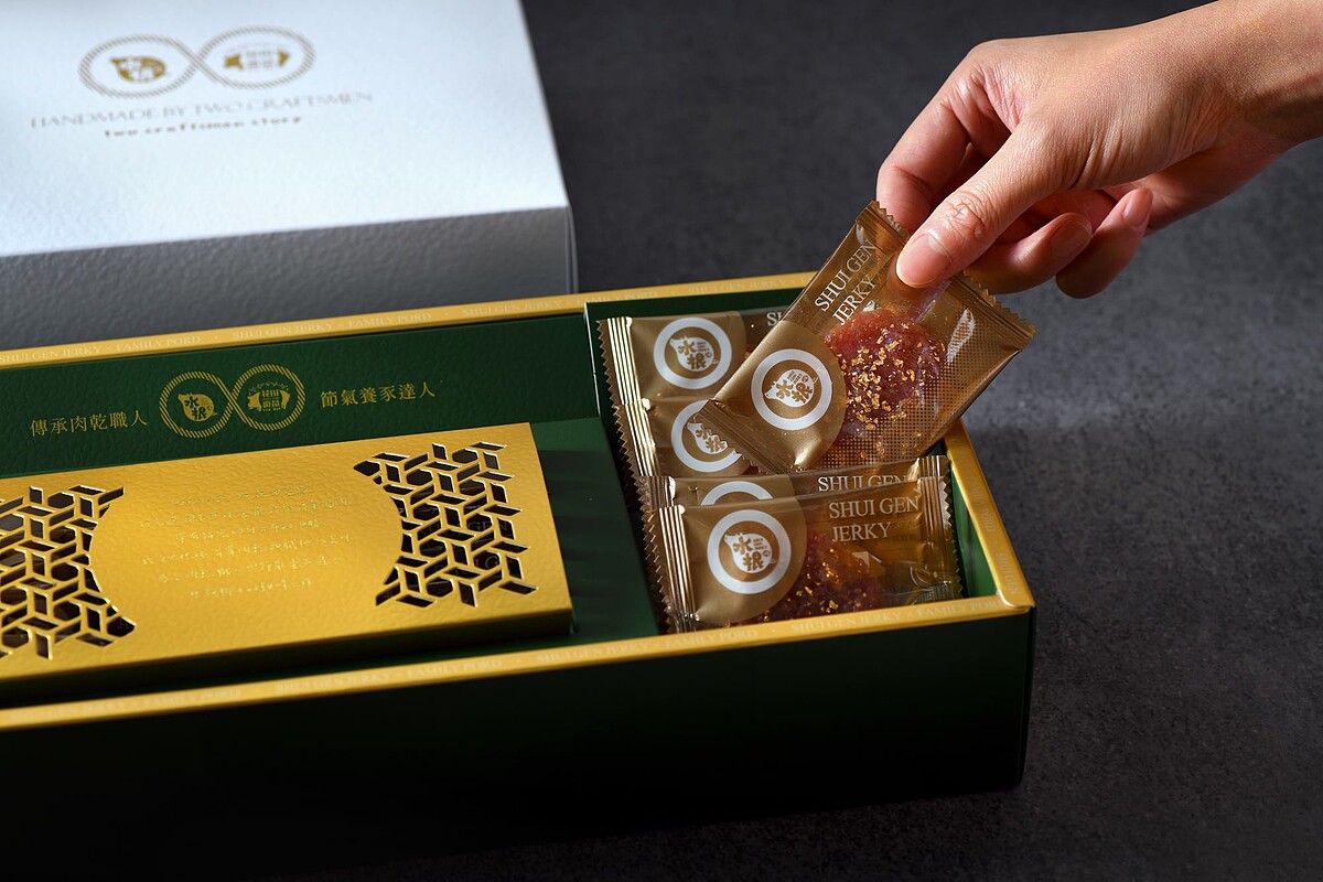 閃著華麗光芒的24K頂級金箔肉乾,以高粱酒、肉桂、白胡椒調味,表面鋪著僅有0.12微米的金箔,每一塊豬肉乾都是在師傅巧手下完成,是款相當耗時費力的產品,就是讓肉乾不只是肉乾,而是要變成每口都珍貴的美食!
