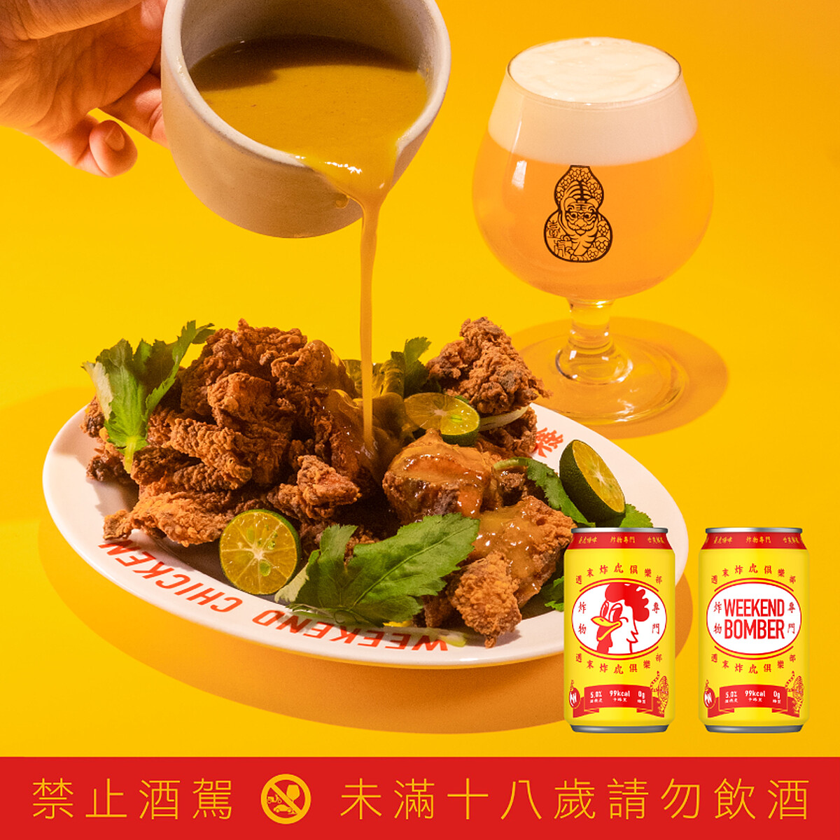 這次的合作還特別推出首支以炸物搭配為主題的啤酒酒款「臺虎生啤酒〈嗨〉週末炸虎限定版」,5%酒精度、99大卡,包裝設計將炸彈與老虎元素呈現,傳遞出「週末炸雞俱樂部」與「臺虎精釀」聯合的「炸虎」威力,包裝顏色延續「週末炸雞俱樂部」的主視覺,以經典台灣飲品的紅黃配色,並以鹽酥雞攤招牌為靈感。