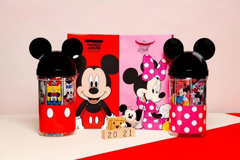 萬歲牌2021年春節首度與迪士尼合作推出造型禮盒,上蓋立體耳朵的造型設計,一對又大又圓的耳朵神還原米奇經典模樣,透明瓶身搭配簡約摩登的幾合圖樣。