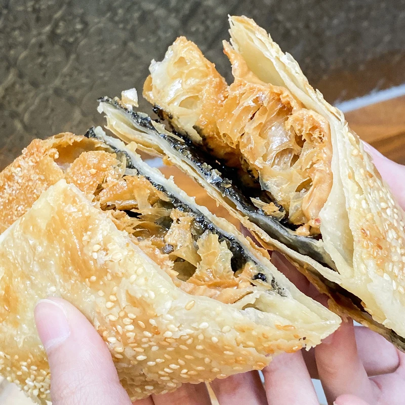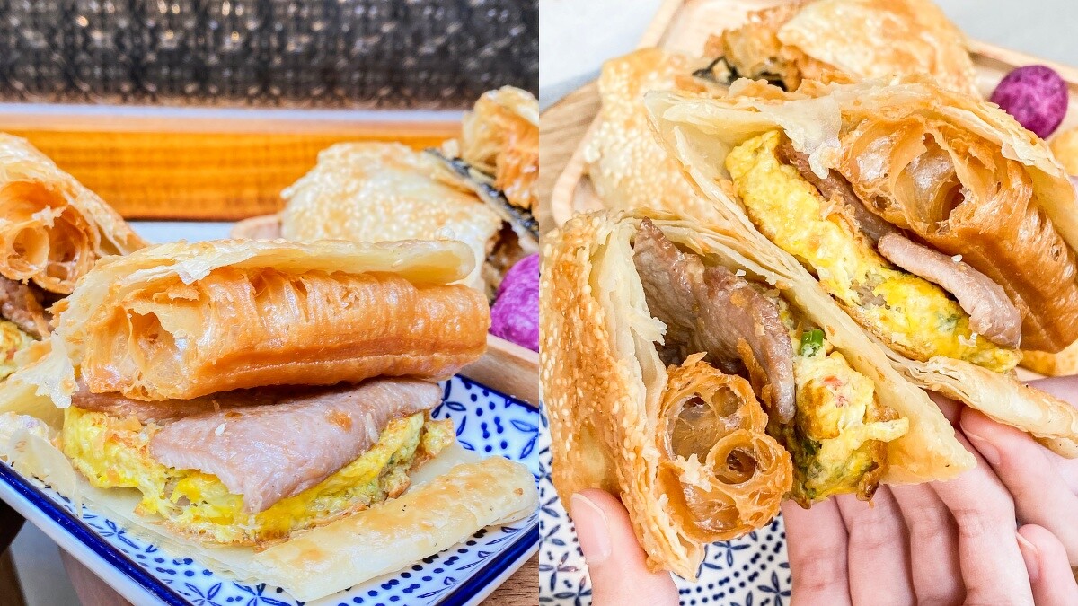 芝麻燒餅皆出自宜蘭老師傅手擀製作,每日直送台北,金黃色的酥香外皮,一口咬下會伴隨餅皮酥脆的喀滋聲響,裡面夾入菜脯蔥花蛋、手工豬排、油條,多層次的鹹香滋味讓人欲罷不能,非常好吃!