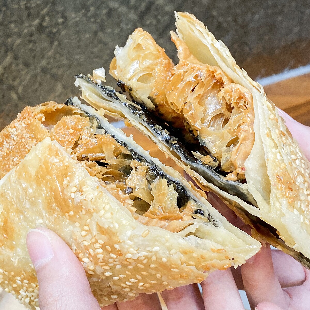 甜口味則在酥脆燒餅中加入了芝麻醬、花生醬、花生糖粉、油條,入口感受面皮與芝麻香氣,還吃得到花生顆粒,甜而不膩的滋味,花生控必點!