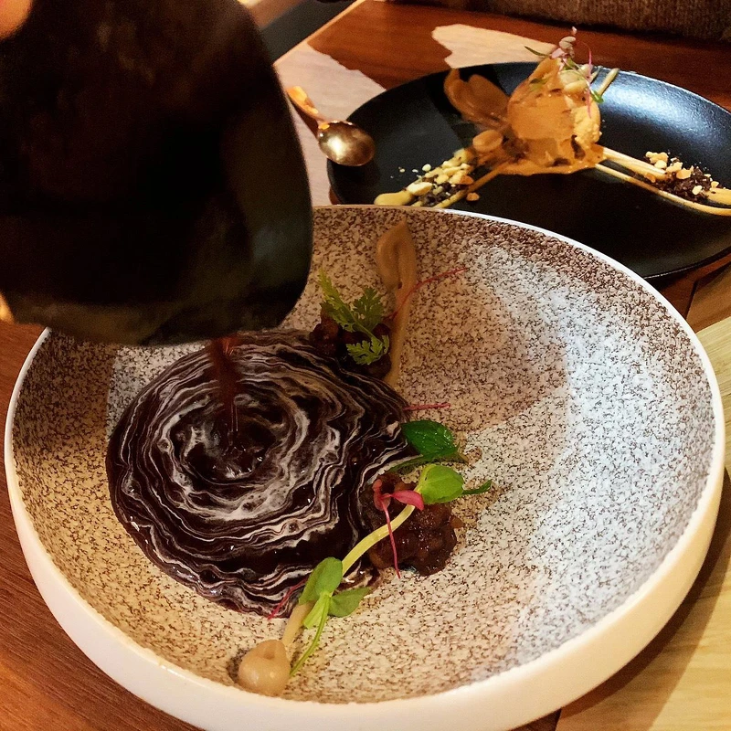 第一道野菜料理共有兩種不同選擇,分別是以超過20種食材精心調配出的黑凱薩醬溫莎拉、高檔的野菇松露溫莎拉作為開胃前菜也非常適合;湯品提供辣牛五花湯或燦金雞湯,碗裡層層堆疊著豐富的食材端上桌後在淋上滾燙的湯頭,撲鼻而來的香氣讓人忍不住想大快朵頤!