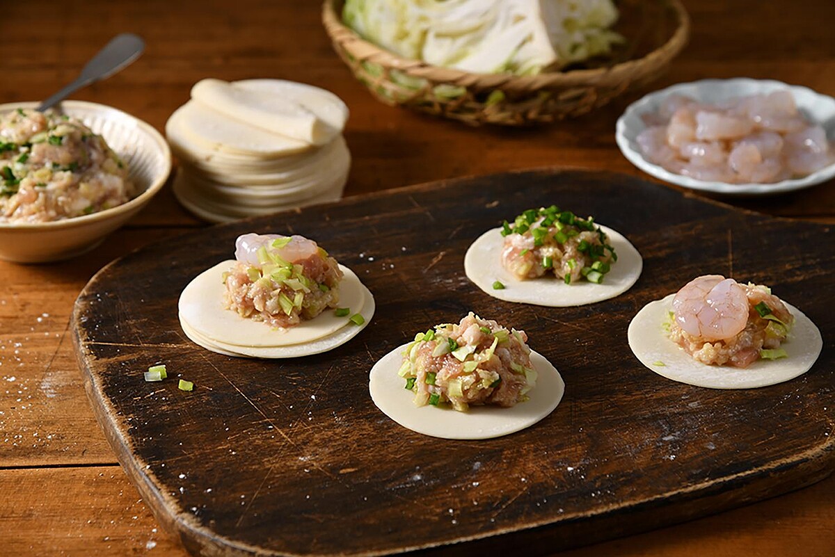 嚴選當日產地直送的新鮮高麗菜及優質的台灣豬後腿肉,以1:1的完美菜肉比例混合,再手工包入一整隻新鮮白蝦,一口咬下爽口鮮甜的滋味,即使不沾醬也非常夠味!