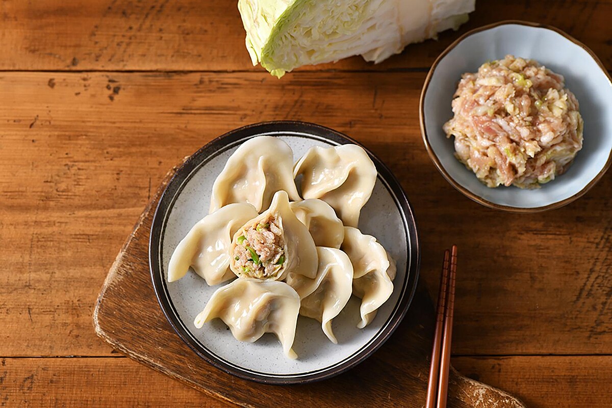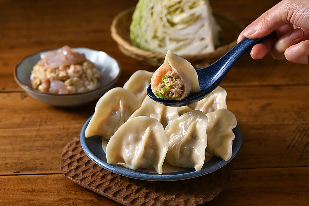 新鮮高麗菜與台灣豬肉以1:1的比例調和,包入帶有嚼勁的水餃皮中,清甜順口,是家中冰箱必備,在家無論什麼時候吃都快速又便利。