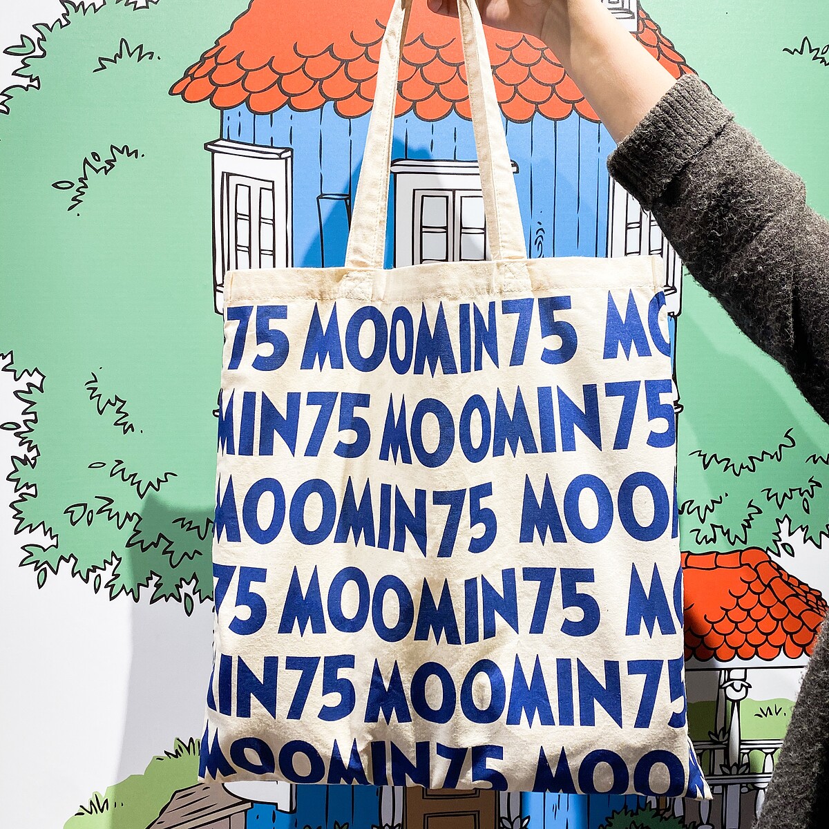 由日本進口75周年紀念商品,包括馬克杯、海報、玩偶和餅乾等,更準備了限量的嚕嚕米75周年紀念托特包,為日本Moomin Café的限定色!