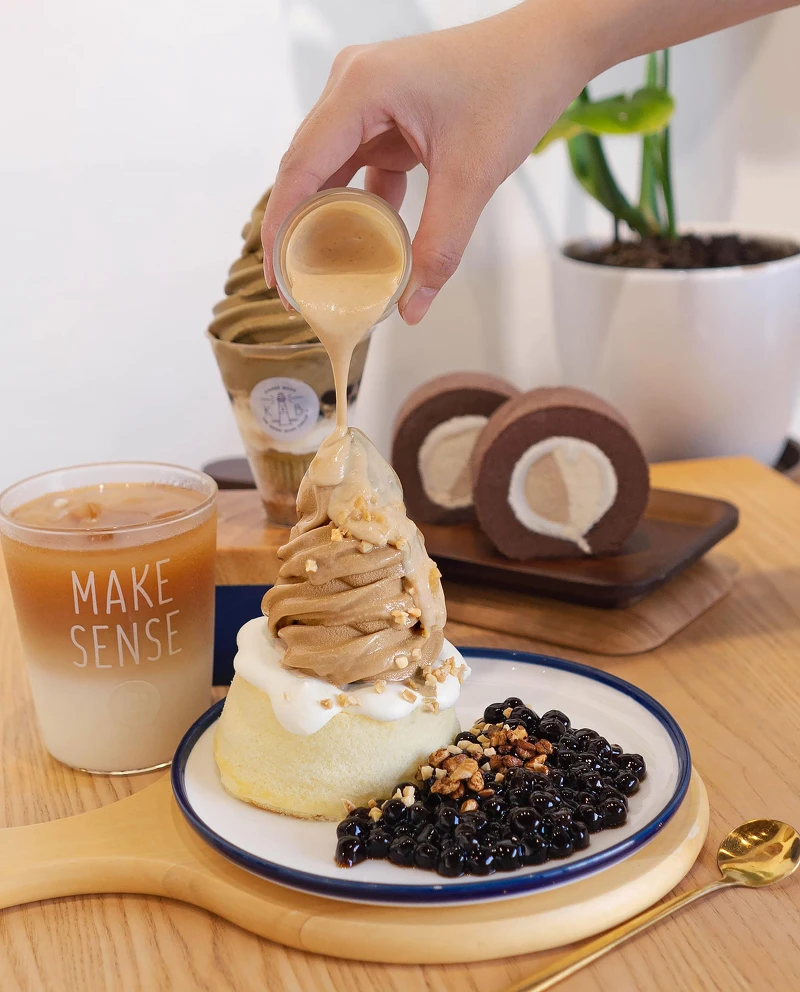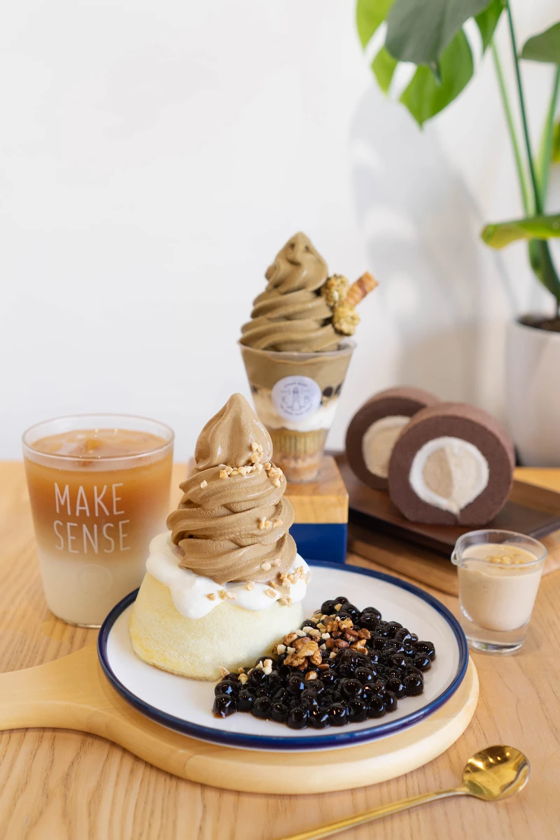 花生與東方美人茶茶霜淇淋融合在一起,感受茶香與花生的濃郁滋味,再搭配鬆軟的戚風蛋糕和黑糖波霸珍珠真的太療癒啦!