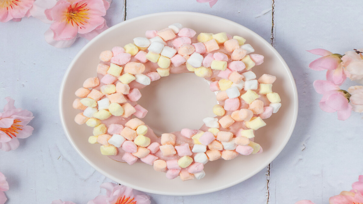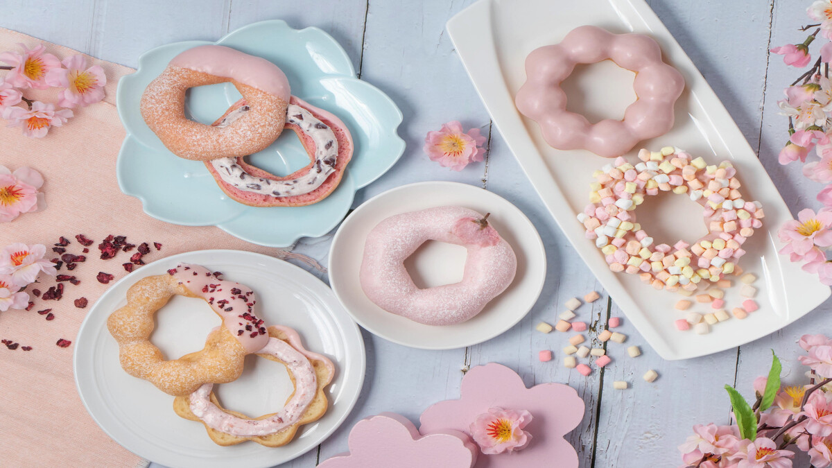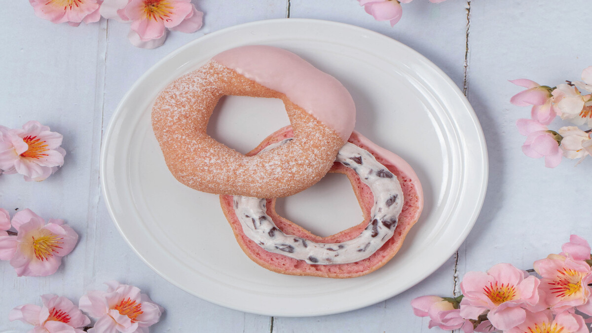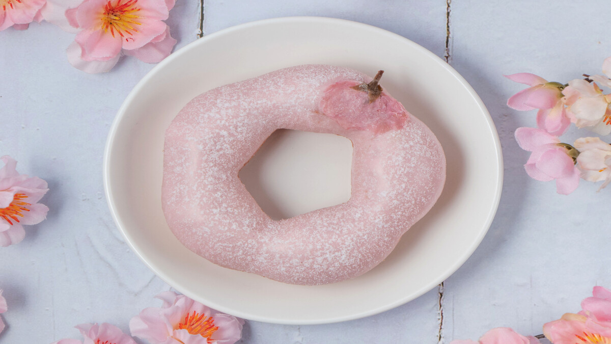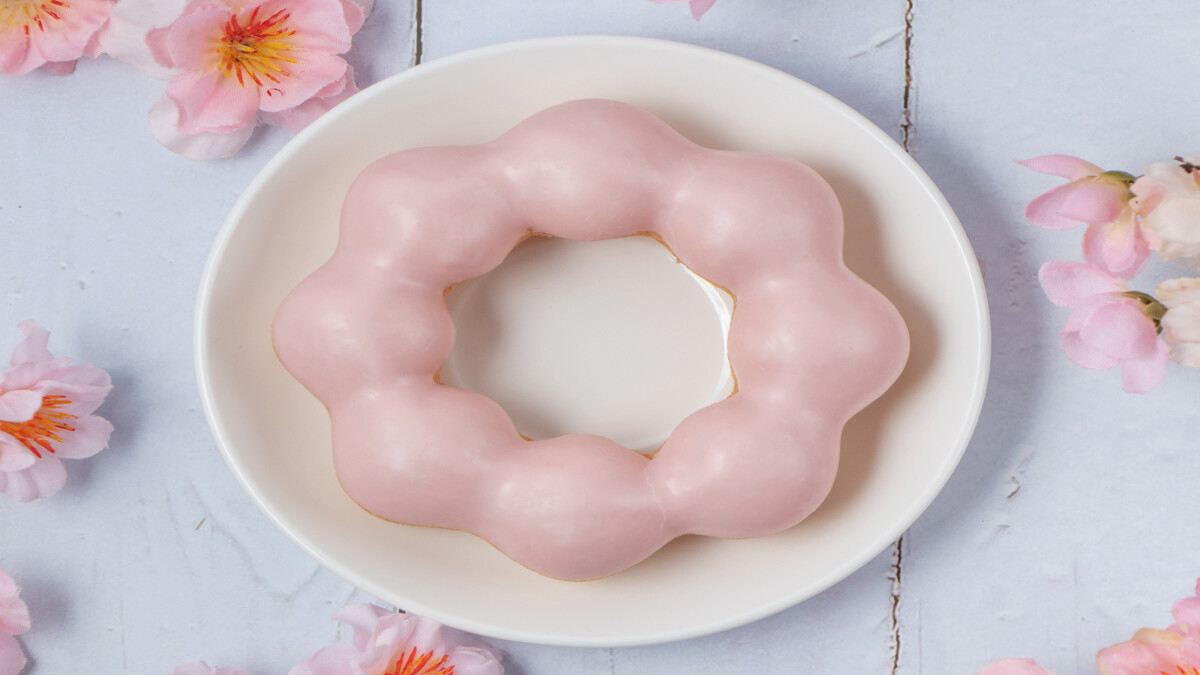 Mister Donut 全新櫻花圈體,扎實微甜的口感帶有淡雅花香。最外層沾裹粉嫩櫻花巧克力,再以鹽漬櫻花點綴,又美又好吃。