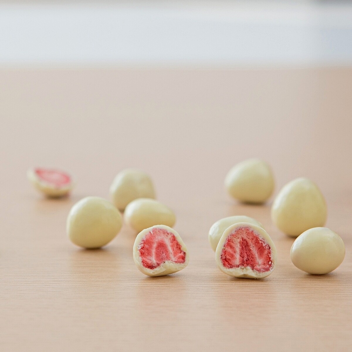 當白巧克力遇上酸甜草莓,叫人如何抵抗?整顆草莓冷凍乾燥後,外層包裹白巧克力,完全是冬季、冷天必備的療癒點心。