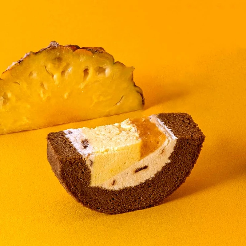蛋糕體以紅玉紅茶風味為基底,尾韻帶有細緻的茶香,而經典的山型內餡中,山頂是鳳梨果肉,底部則是鳳梨慕斯,在生乳餡中加入了些許酒漬龍眼乾點綴,讓整體風味更加提升!