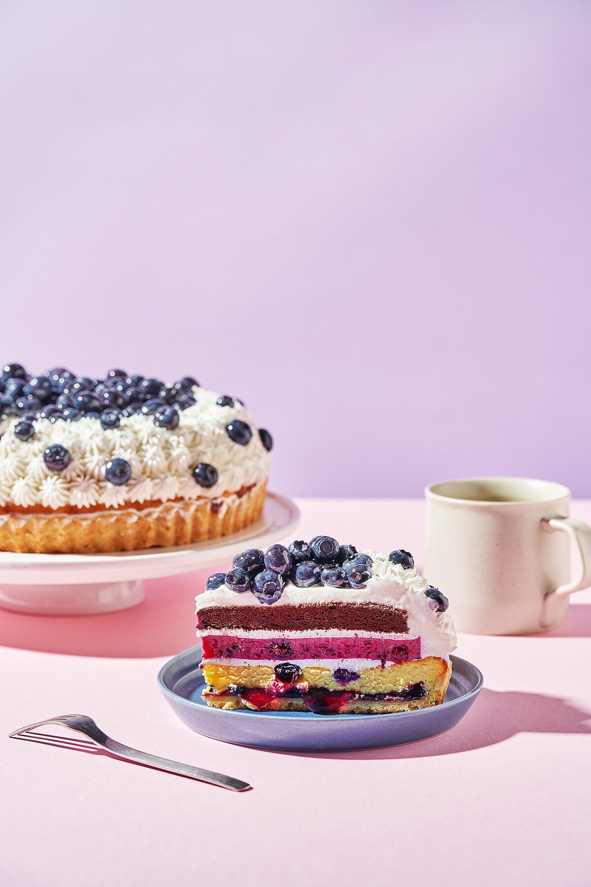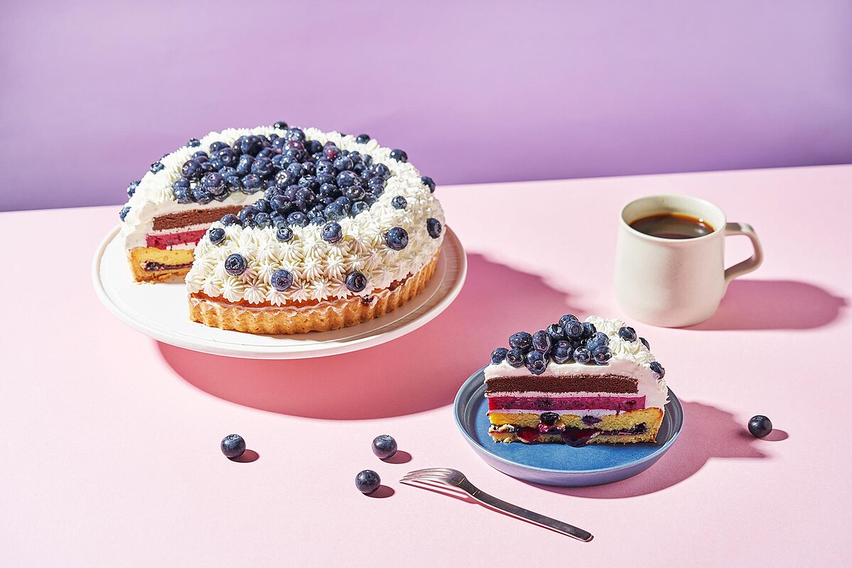 以原味塔皮舖上流心藍莓餡加上濃郁乳酪,再加入新鮮藍莓一起入烤箱烘烤,中層則使用法芙娜巧克力蛋糕配上綜合莓奶凍與日本四葉鮮奶油堆疊,最後放上滿滿的新鮮藍莓做裝飾,甜而不膩口的酸甜滋味,忍不住就吃完一整塊蛋糕啦!