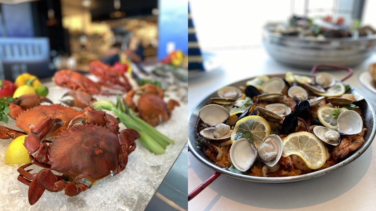 一步出電梯,便能看到Sea To Sky門口招牌以徜徉大海的燈光投射著,延伸至餐廳內部,皆以藍色系裝潢貫穿,整體營造出「海天一色」的用餐環境。另一大特色是提供30種的現流海鮮吧,更能讓老饕們可以自行挑選屬意食材、烹調方式,品嚐專屬於自己的美味海鮮料理。