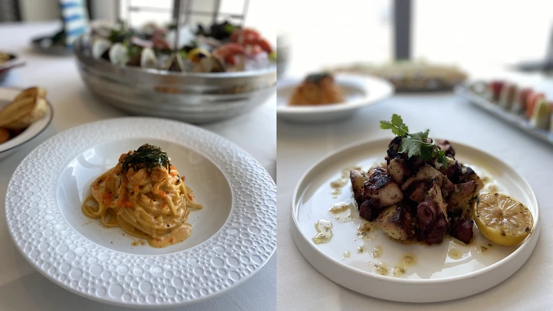主打「分享共食」用餐方式,每道菜色皆適合2~4人享用,有使用各種生魚片製成的「彩虹捲」、經低溫舒肥處理的碳烤章魚、敲開鹽焗保留最真實海味的「鹽焗魚」,以及加入北海道海膽、飛魚卵拌炒的「海膽義大利細扁麵」。另外也效仿Smith & Wollensky招牌巧克力蛋糕,端出網美系甜點「巨大藍絲絨蛋糕」,由梔子花、藍莓提煉,並加入濃郁奶油乳酪醬,讓蛋糕呈現出結合海洋與天空的絕美模樣。
