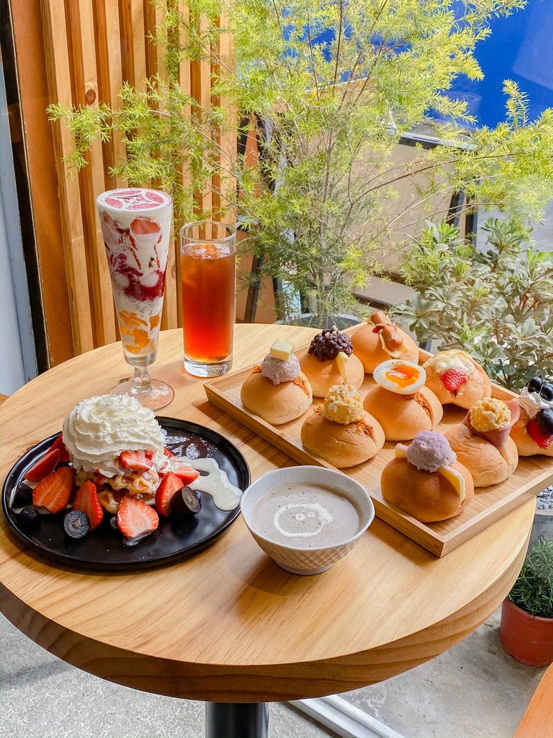 此外,還有鹹食口味像是火腿蛋沙拉、德式香腸起士、溏心蛋老舖肉鬆、蛋沙拉老舖肉鬆、BBQ手撕豬…等,也可搭配套餐水果沙拉及每日濃湯份量剛剛好!