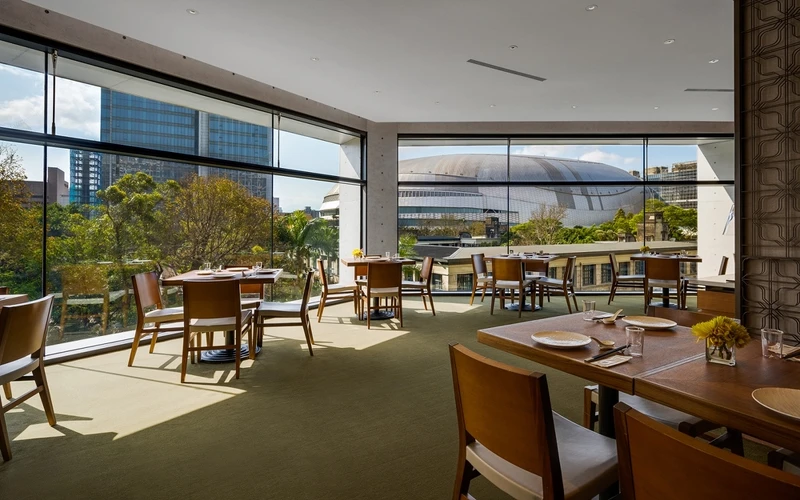 位於誠品生活松菸店3樓的「聚聚樓」,在沿著有東方花卉圖騰的深灰地毯長廊緩緩進入後,便會被巨型環狀落地窗的廣角視野緊抓眼球。除了有自然綠意映入眼簾,更能眺望身為古蹟建築的松山文創園區建築,遠方更有台北101及台北大巨蛋,讓用餐同時享受美好都市風景。