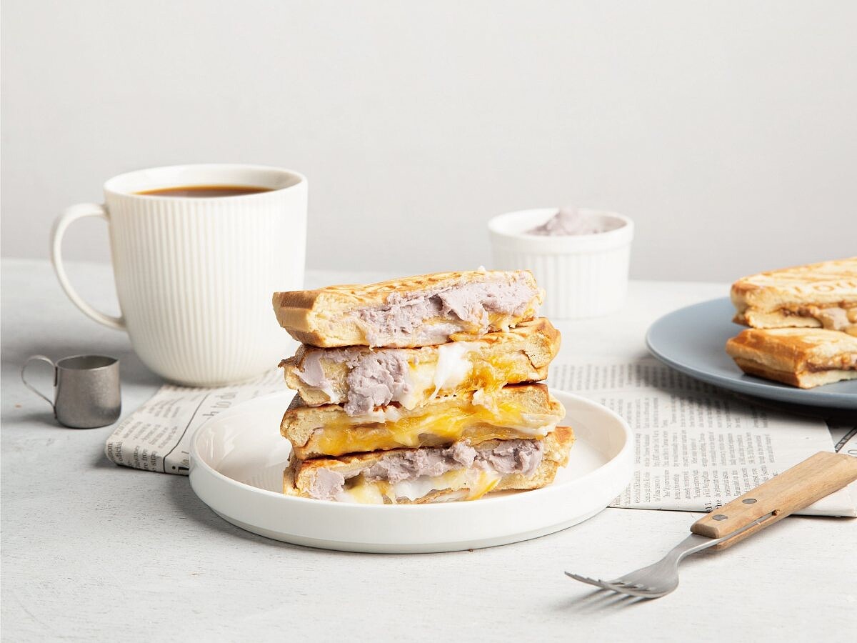 嚴選香Q綿密的大甲芋泥,搭配麻糬、乳酪絲一起熱壓加溫,打造出外層酥脆微焦,內餡香濃Q軟、甜而不膩,芋頭控真的不能錯過!