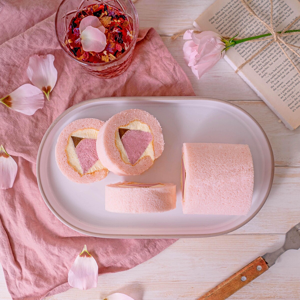 迎接充滿粉紅泡泡的白色情人節到來,以洛神花製作夢幻淡粉色蛋糕體,生乳餡與少量水蜜桃果泥混拌,風味更顯優雅清香。
