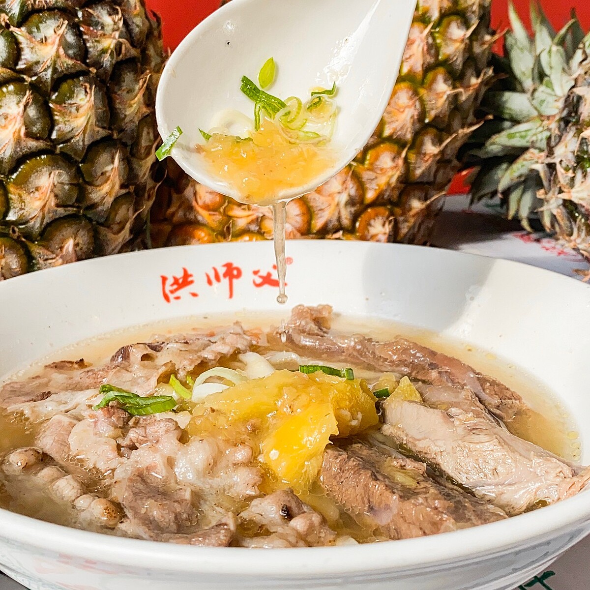 鳳梨尬牛肉麵啦!洪師父以實際支持台灣鳳梨農,將擅長的牛肉麵料理與鳳梨結合出全新滋味。酸甜的鳳梨入菜其實十分適合,無論是鳳梨果汁、鳳梨炒木耳、鳳梨披薩...等鳳梨料理都非常好吃,準備好挑戰鳳梨牛肉麵了嗎?