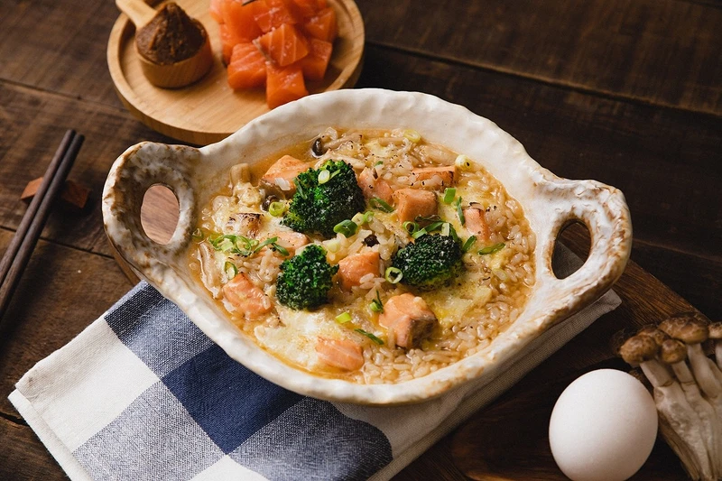 天然鹹度柴魚高湯交匯香氣濃郁的味噌湯底,拌炒鮮甜鮭魚、鴻喜菇、花椰菜熬煮,最後金黃蛋液均勻融合並灑上蔥花,經典呈現濃鮮溫暖雜炊料理。