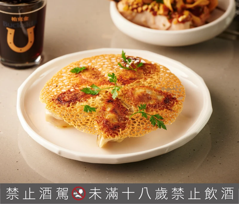 和牛絞肉為主體與豬梅花絞肉混合,放入法國黑松露醬與綜合菇丁做香氣與口感的調和,脆煎後表面呈現美麗蕾絲網狀,餃子皮酥脆,內裏濕潤、湯汁風味濃厚。