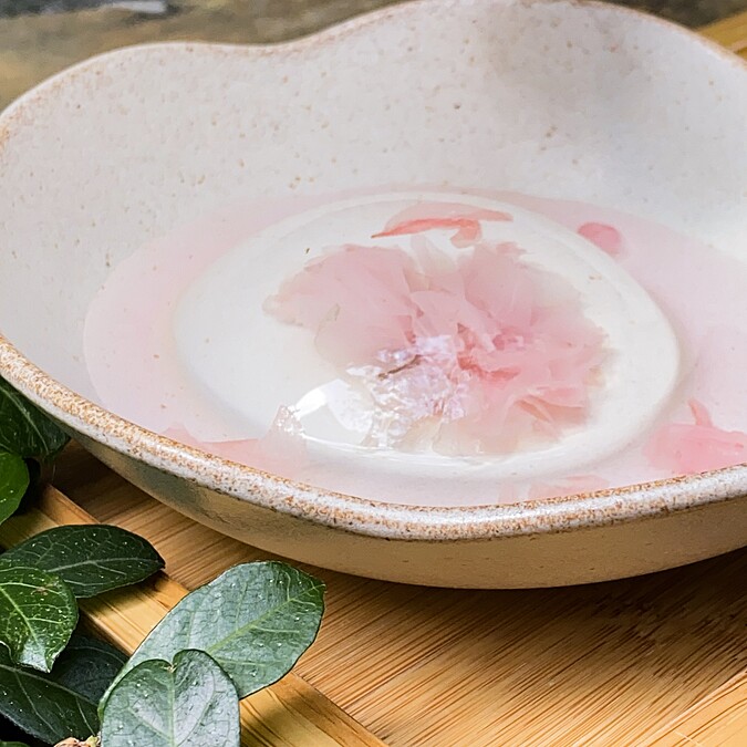 甜點是帶有濃濃日式風情的透明系甜點「水信玄餅」,彷彿櫻花掉進池塘般瞬間,再搭配手工蜜糖蜜、黃豆粉一同享用,宛如一秒到日本!