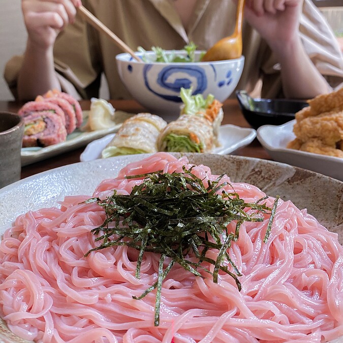 櫻花粉色的麵條絕對會秒殺大家底片!入口品嚐帶有柚子、紫蘇香氣,口感十分清爽,喜愛清爽風味的人不能錯過。